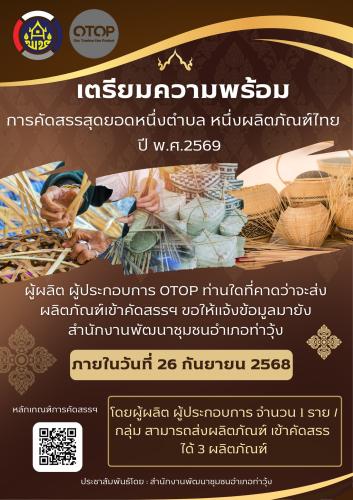 สำนักงานพัฒนาชุมชนอำเภอท่าวุ้ง ขอประชาสัมพันธ์การเตรียมความพร้อมกับการคัดสรรสุดยอดหนึ่งตำบล หนึ่งผลิตภัณฑ์ไทย ปี พ.ศ.2569 (OTOP Product Champion : OPC)