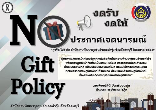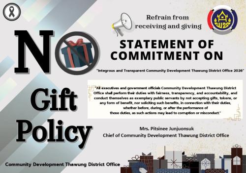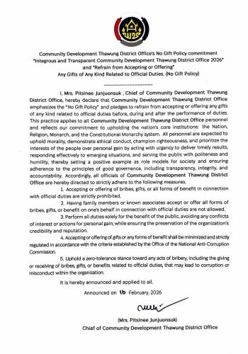 สำนักงานพัฒนาชุมชนอำเภอท่าวุ้ง จังหวัดลพบุรี ขอประกาศเจตนารมณ์ "สุจริต โปร่งใส สำนักงานพัฒนาชุมชนอำเภอท่าวุ้งใสสะอาด 2569" และ "งดรับ งดให้" ของขวัญ ของกำนัลทุกชนิดจากการปฏิบัติหน้าที่